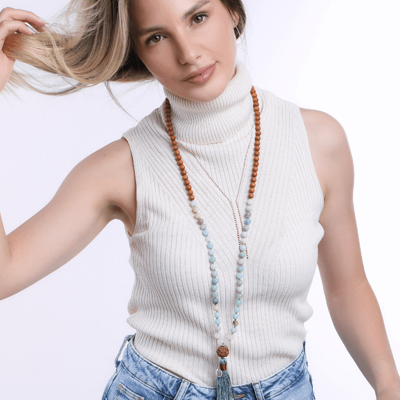 Collana Mala "Dolce Rilassamento" con Amazzonite e Perle di Legno di Sandalo