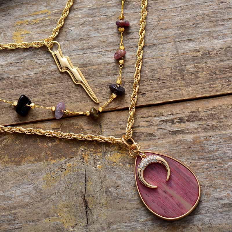 Collana "Mezzaluna Astrale" in Onice e Rodonite Dorata
