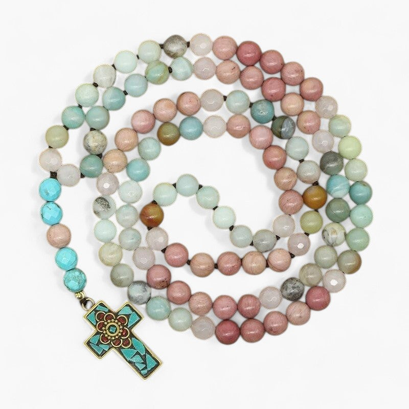 Collana "Croce Sacra" con Amazzonite, Rodonite e Quarzo - Fede e Speranza