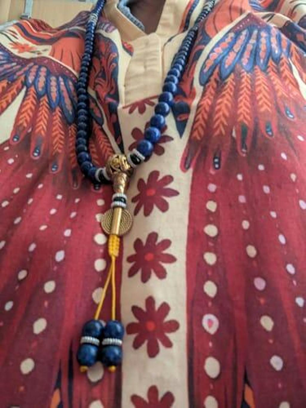 Ogni mala è lavorato interamente a mano con lapislazzuli puro e incorpora tre autentiche perle Dzi, unendo la sapienza dell’antico Egitto alle tradizioni di protezione spirituale del monastero tibetano di Drepung.